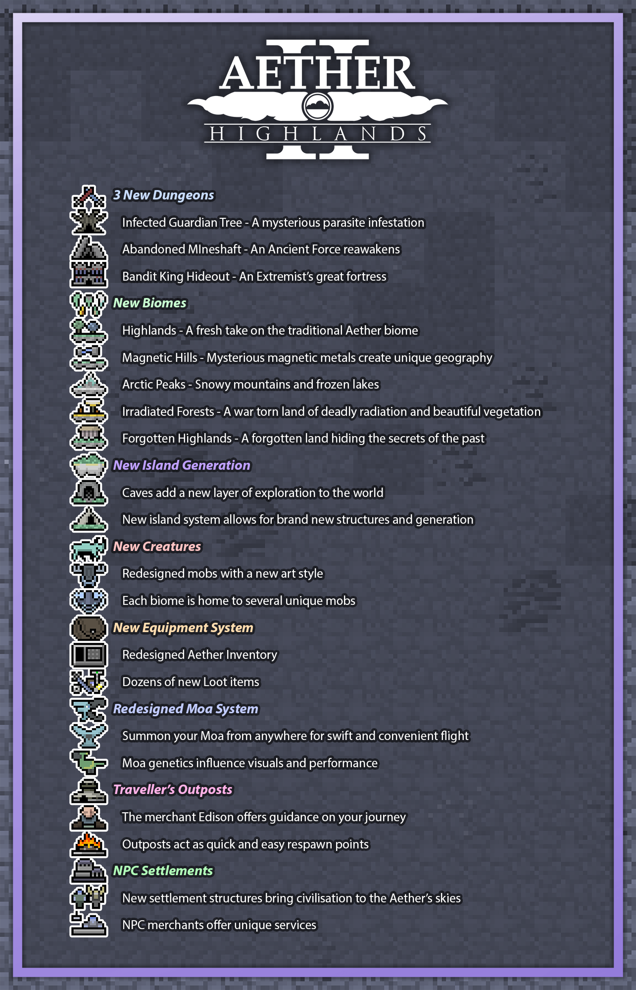 The Highlands Update, is an upcoming major update for the Aether II mod. It will focus primarily on the addition of several new major biomes and island terrain generation but includes additional other features such as NPC Angel villages, Moa genetics and more.[1][2]